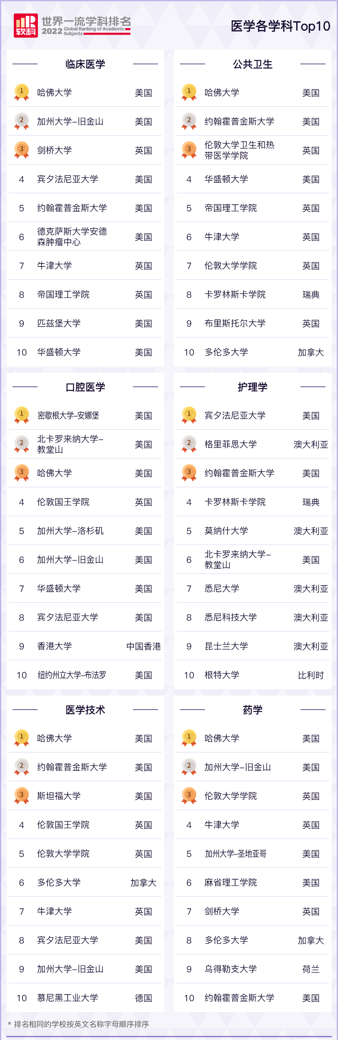 医学 专业美国依旧包揽了前列,其中, 哈佛大学占据了4门学科的全球第一 ;另外加拿大 多伦多大学 在今年的学科排名中进步很大,在医学技术专业上升3位,位居TOP6;在药学专业上升2位,位居TOP8。