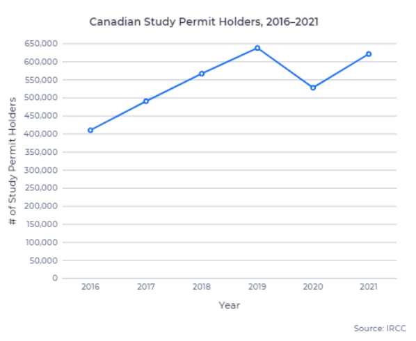 事实上,加拿大的国际学生人数从2016年的49万增长到2019年的63.8万,增长了55%。 虽然在经历了疫情之后,加拿大国际学生数量有所下降,我们还是可以从2021年的统计看到,学生们很快又回到加拿大的学校学习。