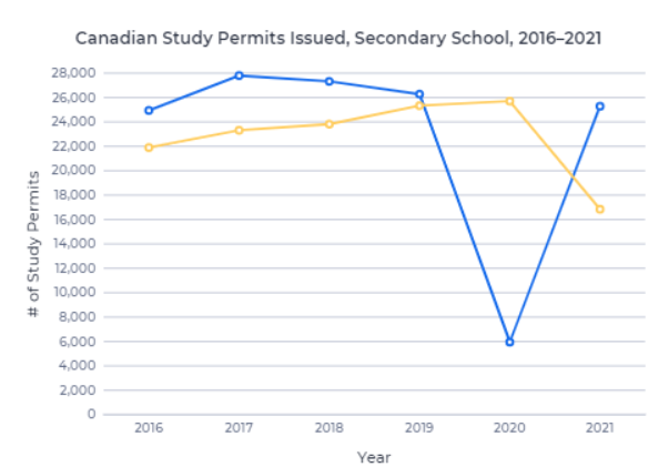 加拿大的国际中学生人数占整个加拿大中小学国际学生市场总人数的64%,并且占2021年新签发的加拿大所有层次学习许可数量的8%。 下图显示了 2016 年至 2021 年间,加拿大颁发给国际中学生的学习许可数量: