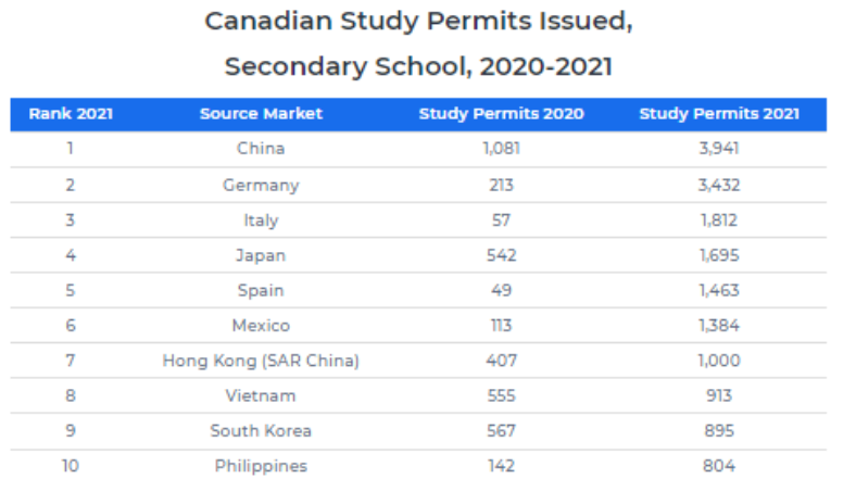 下表显示了 2020 年和 2021 年,加拿大颁发的新学习许可和学习许可总数排名前10的生源市场。 历年来, 中国一直是加拿大国际中学生的最大来源市场,到 2021 年依然如此, 共发放了 3,941 份学习许可。