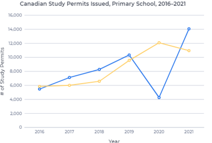 在2021年,加拿大发放给国际小学生的新学习许可数量为14,065 份, 比 2020 年增加了 9,801 份,增长了 230%,增幅接近中学板块(325%)。