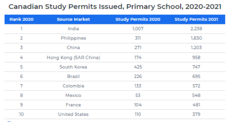 下表显示了 2020 年和 2021 年,加拿大颁发的国际小学生,新学习许可和学习许可总数排名前10的生源国数据。 我们可以看到,中国以及中国香港前往加拿大选择小学教育的数量也在倍数增长, 这些数字很大程度上反映了来到加拿大就读高等教育的成年学生带上了他们年幼的孩子。