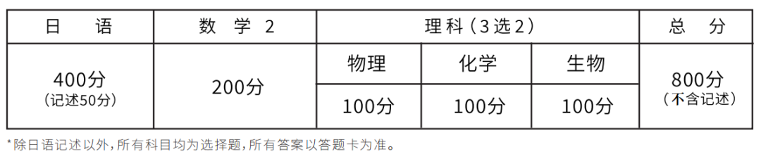 理科类考生 需要参加 日语、数学 2 、理科 三门考试。总分 800 分(不含记述分)。部分大学或专业仅要求提交其中 1 或 2 门科目成绩。