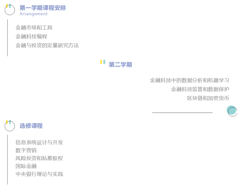 该课程由 120 学分的核心科目和可选科目,以及 60 学分的论文组成。学生将学习与金融技术相关的核心科目,并且根据自己的职业抱负选择相关的科目。