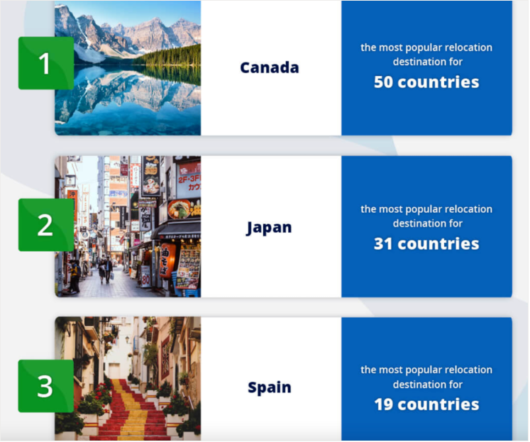 其中,加拿大排名第一,被认为是世界上其他50个国家居民的梦想之家。日本和西班牙分别排名第二和第三。