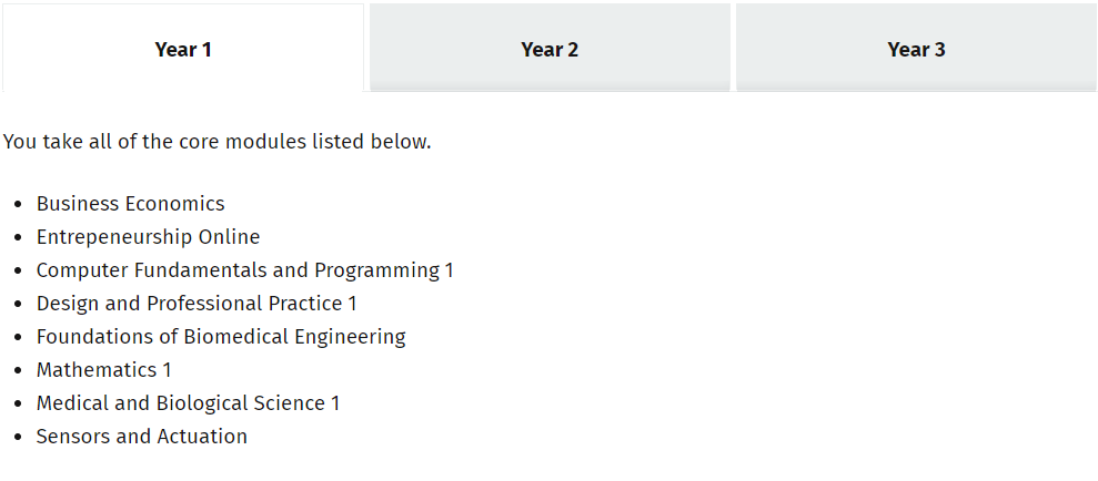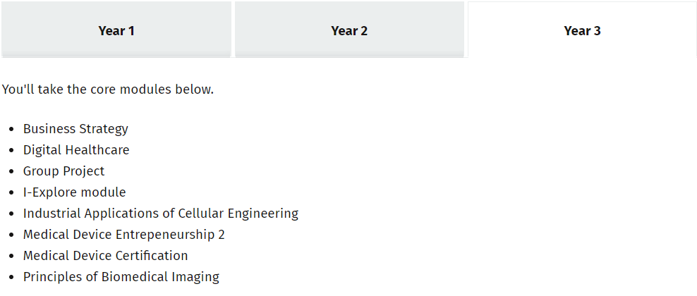 前面我们也说到了,这是一个将 工程、医学、生物、商业 四大学科领域相结合的复合型专业,因此在三年的课程设置上每一年都有所体现。