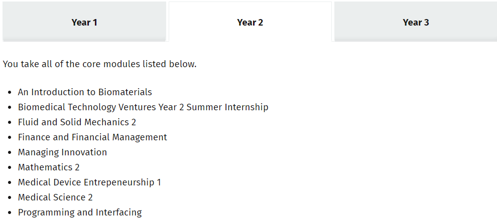 这门课程非常强调实践,可以在第二年进行实习,获得真实经验。课程最后,需要设计、制造和测试一个生物医学问题的工程解决方案。