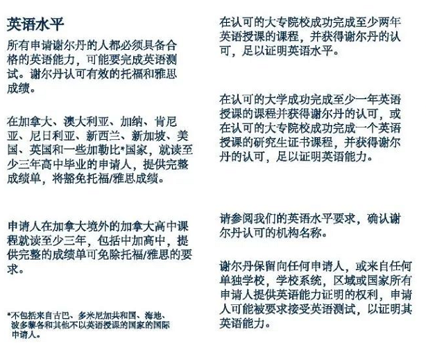 申请人如持有安大略省中学文凭(OSSD)或中国同等学历,包括一门高级英语课程或同等雅思/托福成绩,加上其他所需的必修课,就可获得录取,成为谢尔丹全日制学生。申请人是否合格将根据他们以前的学业成绩来选择。