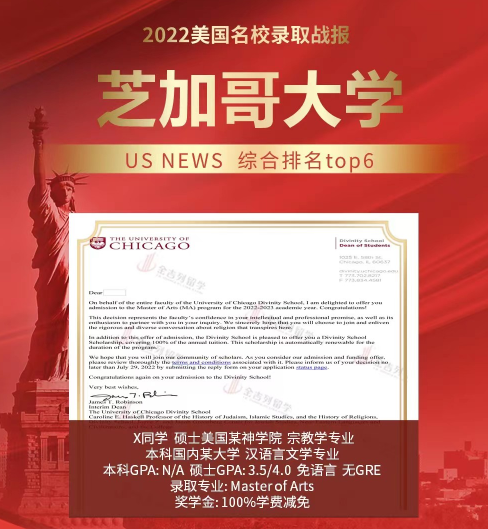 录取结果:芝加哥大学(全美第6)文学硕士 100%学费减免