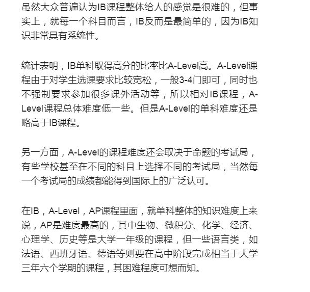 严格意义上来说,IBDP, A-Level属于学术课程,而AP跟SAT,TOEFL一样属于标准化的考试课程。我们将从课程设置、课程难度、评估方式和大学认可度几个方面着手进行比较。