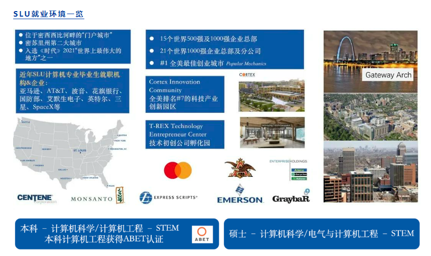 圣路易斯大学位于密苏里州圣路易斯市,是众多财富500强与1000强的大本营,更拥有全美#7的创新区——CORTEX,当地对计算机科学家与软件工程师有很高需求。