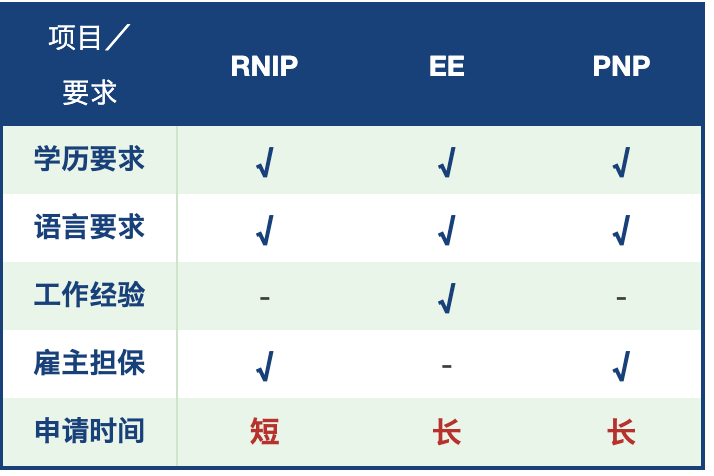 对RNIP、EE和PNP三个移民项目的要求进行了简单的比对,方便各位小伙伴直观看出它们的区别: