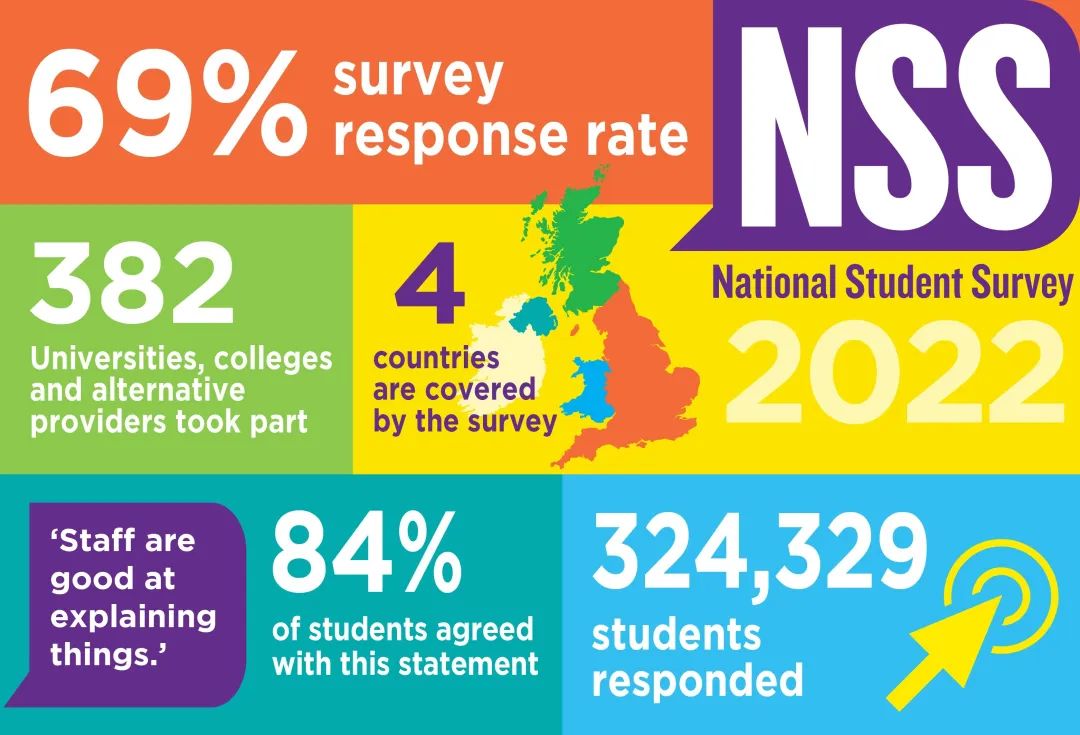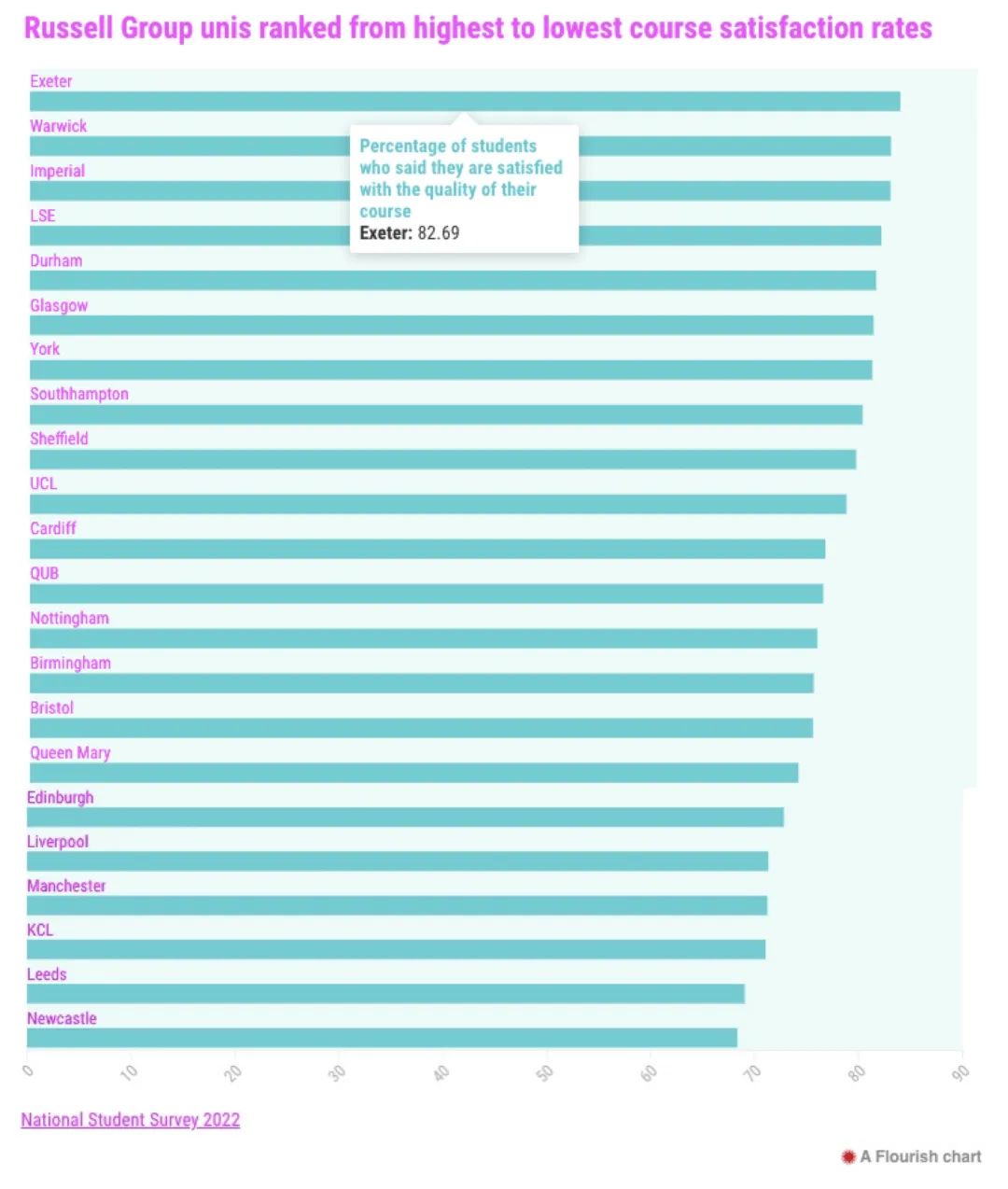 以罗素集团的热门大学为例,绝大多数学生都对他们的课程感到满意——在参加 2022 年全国学生调查的 324,329 名学生中,77% 的学生对课程质量感到满意;埃克塞特大学挤掉G5位居榜首,有 82.69% 的学生表示对课程质量感到满意。