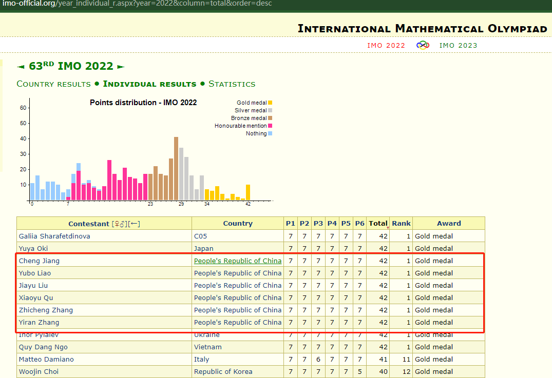 自2019年以来,中国队已经连续4年获得团体第一,这也是自1989年中国队首次取得团体第一之后的第23次第一!六位同学更是拿下全员满分的绝佳成绩,使中国队成为继1994年美国队首次获得IMO全员满分之后,第二支获得全满分的队伍!祝贺中国队!