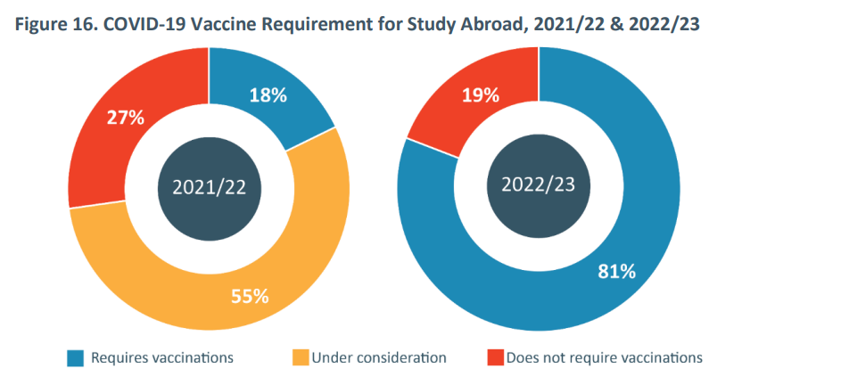 大约81%的学校规定,学生必须接种新冠疫苗。这一要求占据的比例相较于2021-22年度显著增加,当时大多数学校仍旧在考虑是否需要强制学生接种疫苗(55%),只有18%明确制定了疫苗接种要求。