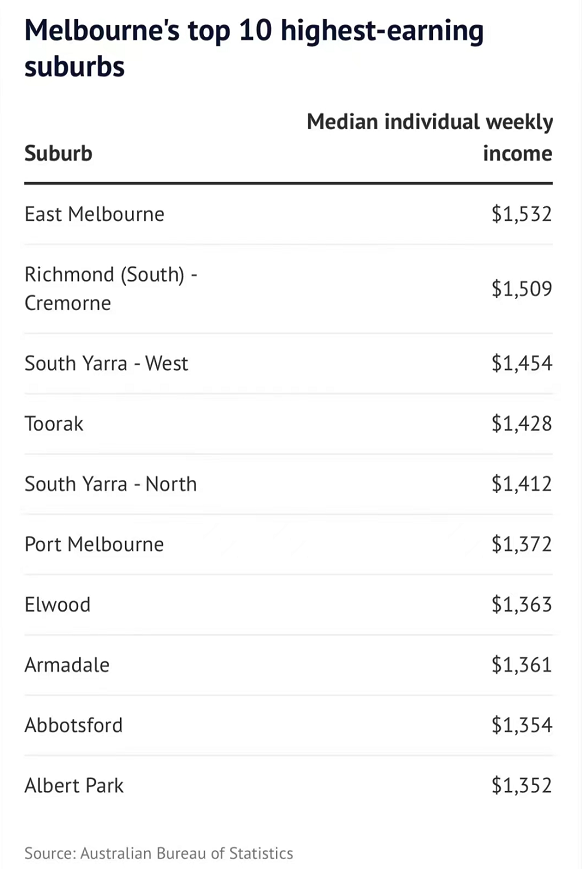 墨尔本哪些地区收入最高,最新排行出炉,第一名出乎意料!每周个人收入相比之前,有明显提高!