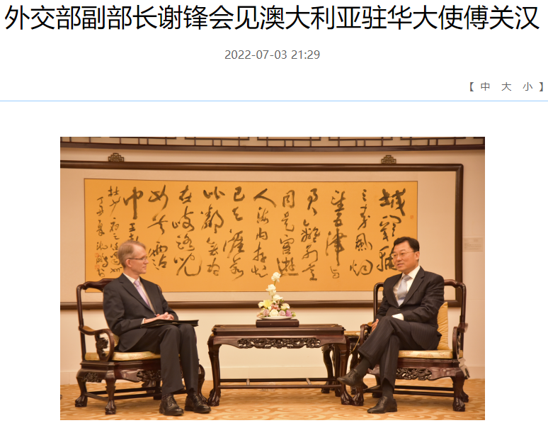 而在上月底,澳洲驻华大使Graham Fletcher与中国外交部副部长谢锋会面。