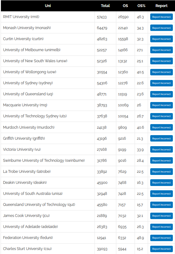 从统计表可以看出,国际学生人数最多的大学是皇家墨尔本理工大学(RMIT),有超过26,000名国际学生,莫纳什大学有超过22,000名国际学生,科廷大学有大约15,000名国际学生。就国际学生的最高比例而言,联邦大学约有48%,皇家墨尔本理工大学约有46%,莫道克大学约有40%。
