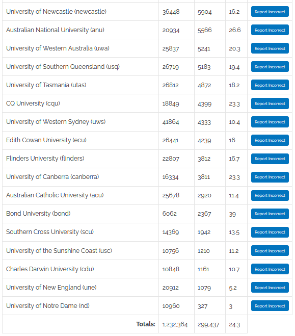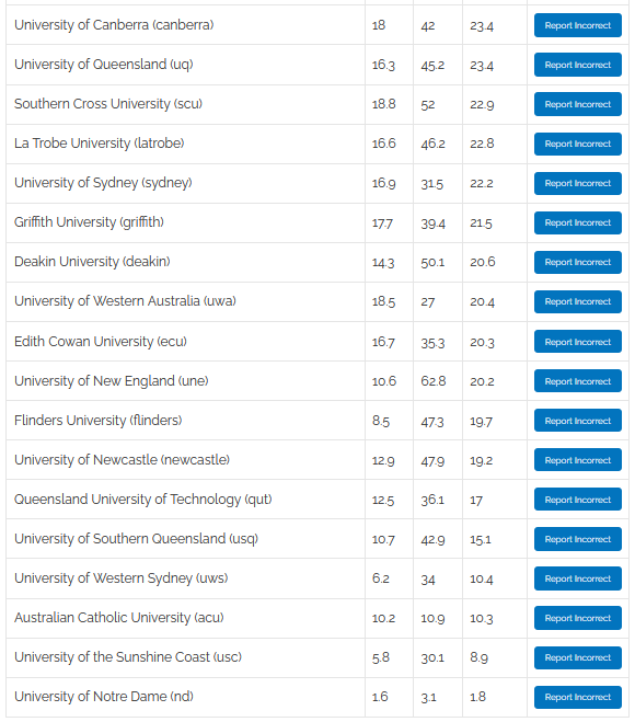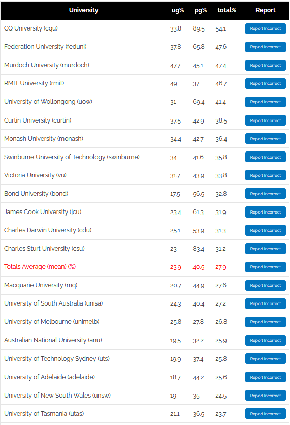 大家重要的是还要查看下表,不包括远程教育学生人数,显示澳大利亚大学本科生、研究生和总人数类别中海外学生的实际校内比例。