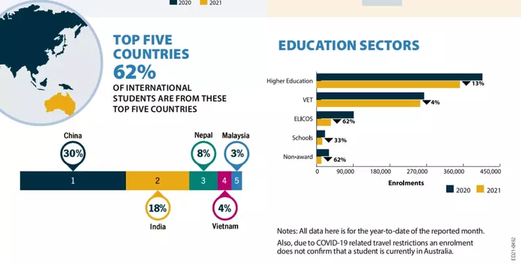 在澳洲的全部国际学生中,中国留学生占比例最高,达到30%。中国在主要学生签证持有者中排名第一,超过了印度、 尼泊尔、越南和马来西亚。