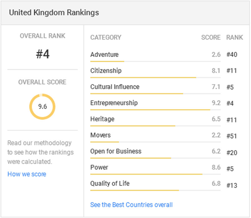 在2018 US News 世界最佳国家综合排名中,英国位列第四,在不同的领域表现都很不错。
