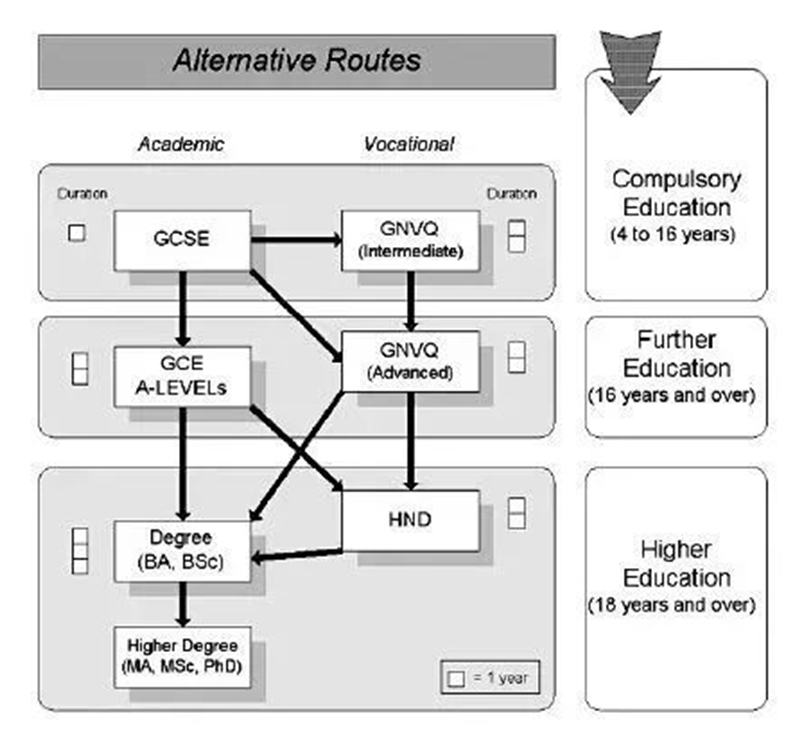 在这种金字塔式的选课方式中,学生充分展示出了自己的兴趣和爱好,学习有了主动性,也为以后大学的学习以及从事的职业奠定了基础、明确了方向。 延续教育 在16岁完成了国家法律规定的义务教育后,可以选择工作也可以继续学习。16-18岁就读年级称为中学高级班或大学预备班,是中学至大学的过渡期,也称之为继续教育阶段,主要有学术和职业学习两个方向。 普通教育高级证书即A-Level,是学业路线的重要内容。A-Level总共有一百多个科目,学制两年,专业分科极为细致。