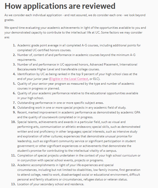 并且在加州大学官网上公布的“13条录取审核标准”中,标化成绩这一标准也不见踪影,而高中GPA、年级排名、高级课程、课外活动、文书等变得更加重要……