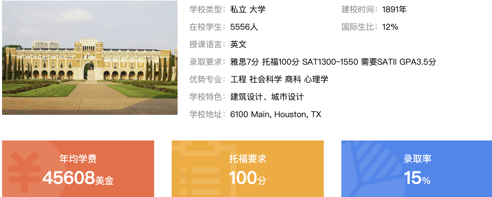 莱斯大学(Rice University),简称Rice,位于美国得克萨斯州休斯敦市郊,离市中心仅三英里车程。为全美顶尖私立大学之一、美国南方最高学府,是一所世界著名的私立研究型大学。