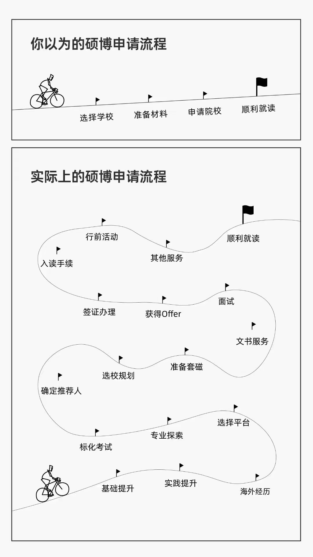 很多学生问:为什么我需要花钱找中介申请学校?没必要花这笔钱啊,我完全可以自己申请,也能录取到很好的院校~下面来看看你以为的留学申请与实际的留学申请对比,带你一分钟了解完整的硕博申请流程。