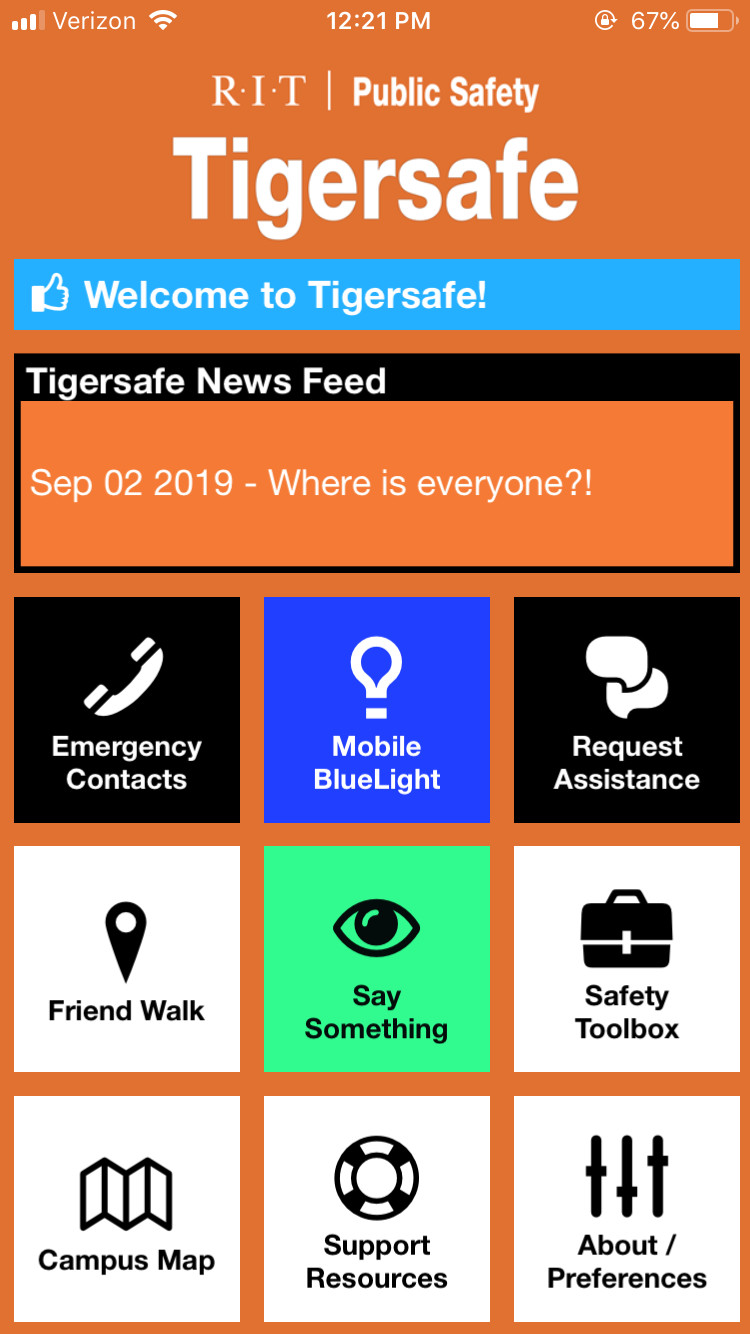 TigerSafe APP有非常强大的保障功能,其中包括一键报告、报警,校园蓝光路灯(一种可以报警并自动发送准确位置的安全路灯)、“送我回家”功能,校园地图……等等
