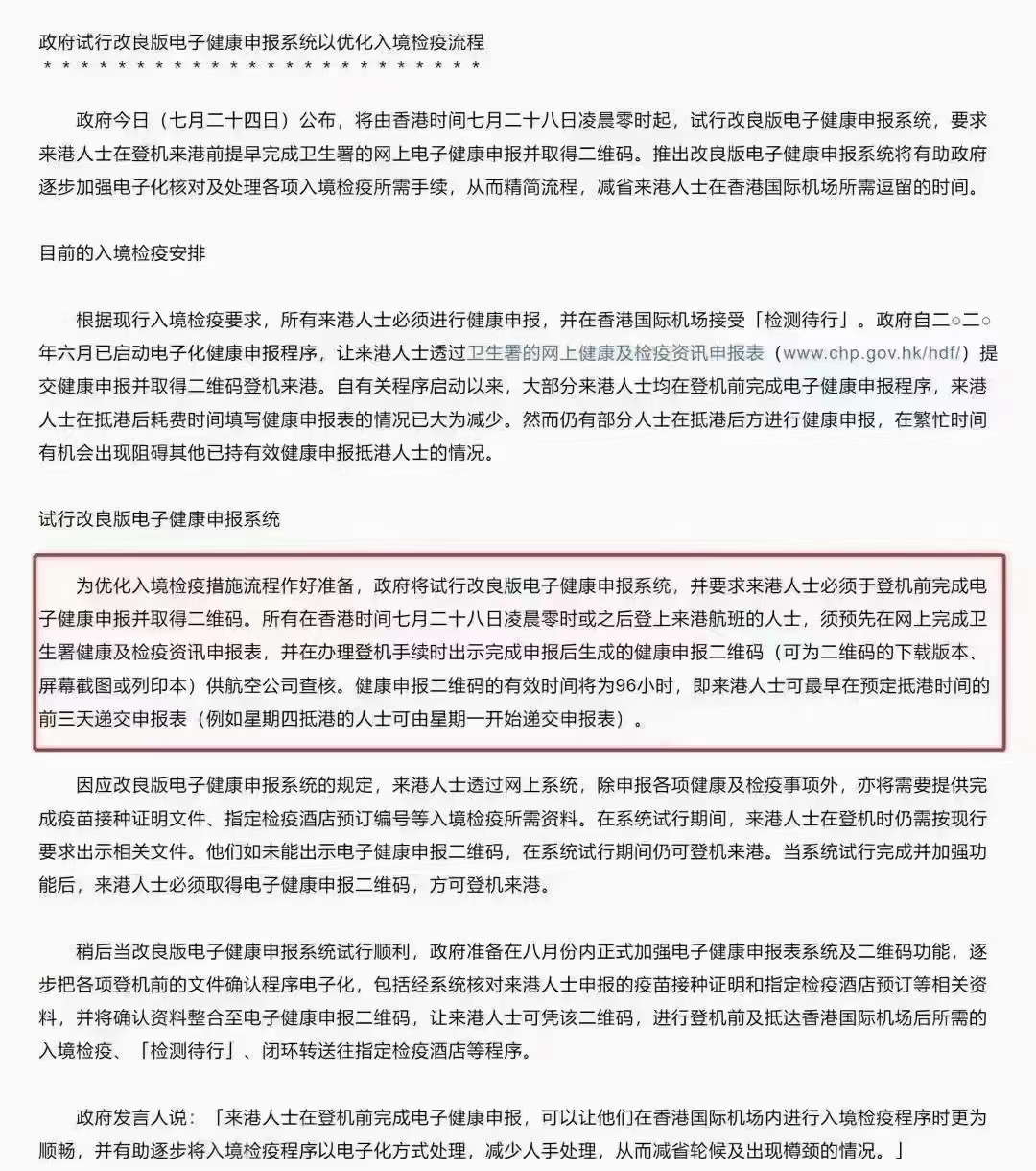 7月28号开始,来港旅客必须提前在网上申报并取得二维码才能登机,否则拒绝登机