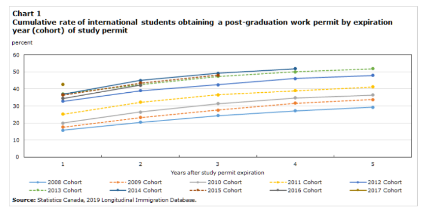 而且,根据历年数据显示,2008至2018年,有差不多一半的国际学生会在毕业后申请PGWP,有近四分之三的PGWP持有者在获得签证的五年内拿到了枫叶卡,其中,完成加拿大大学和硕士学历的PGWP持有人PR转换率最高。