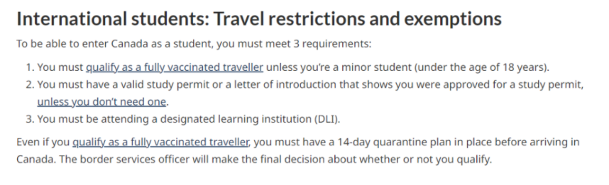 在留学入境方面,国际学生只需满足以下要求,并在入境前14天完成疫苗接种即可。 而中国的 科兴 和 国药疫苗 均被加拿大政府所承认。