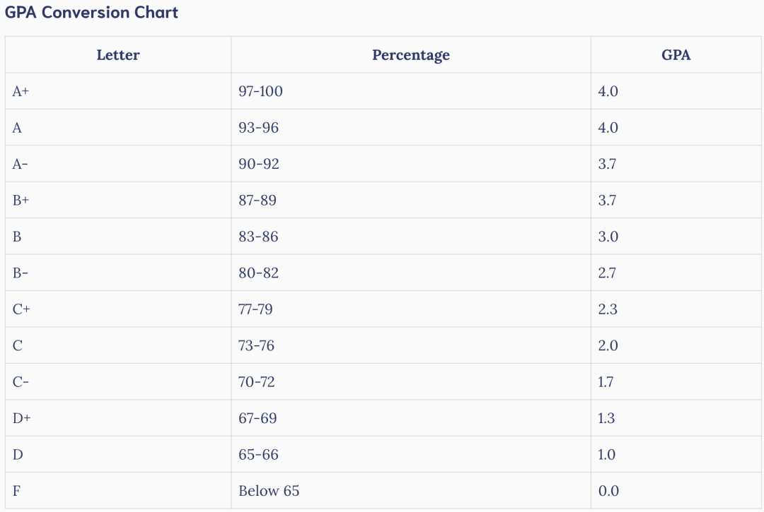 在几乎所有情况下,字母等级对应标准的分数:A等级是4,B等级是3,C等级是2,D等级是1。正负分值分布均匀:例如B+是3.3分,而A-是3.7分。由于这个原因,所有课程获得As平均成绩的学生的GPA就会超过4.0。