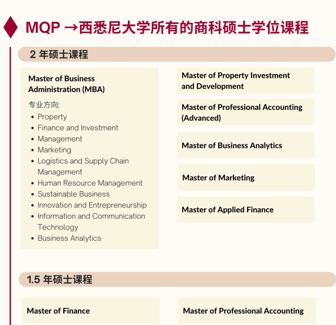 成功完成《专升硕课程》的学生将可升读西悉尼大学所有的商科硕士学位课程(1年制商科硕士除外)。详情请参阅下图: