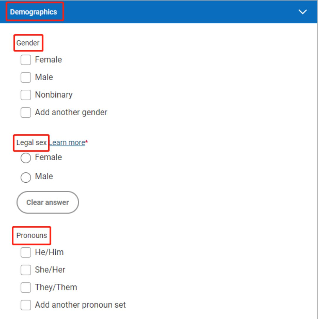 2.1 Common App一直致力于“更具包容性的性别选择”。所以2022-2023年申请季,Common App又在性别这一栏做了新的添加。申请人性别信息的填写移动到了Demographic栏目,并且顺序为Gender,Legal Sex和Pronouns,提供了更多包容性。