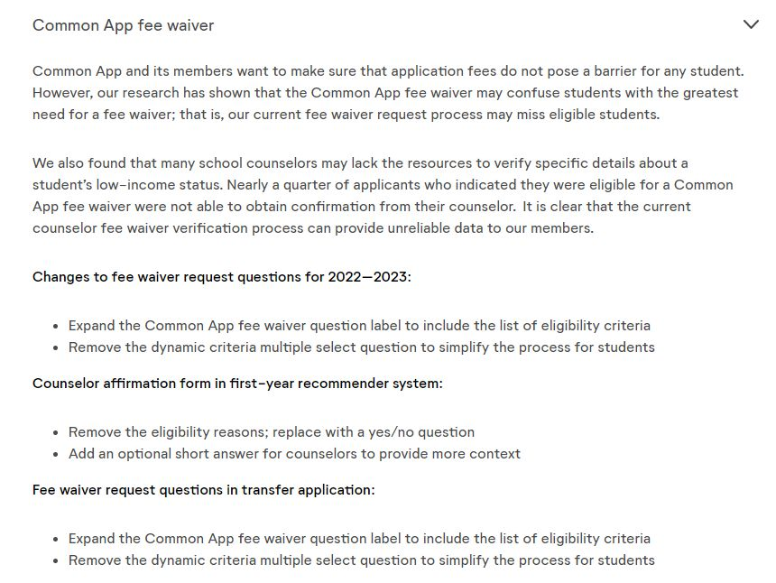 扩展Common App费用减免问题标签,删除动态化标准的多选题来简化流程。新增Fee Waiver申请费减免标准为了不让申请费成为申请人追梦的阻碍,所以今年CA申请费用减免包含资格标准,如果符合其中任意一条就可以申请Fee Waiver。