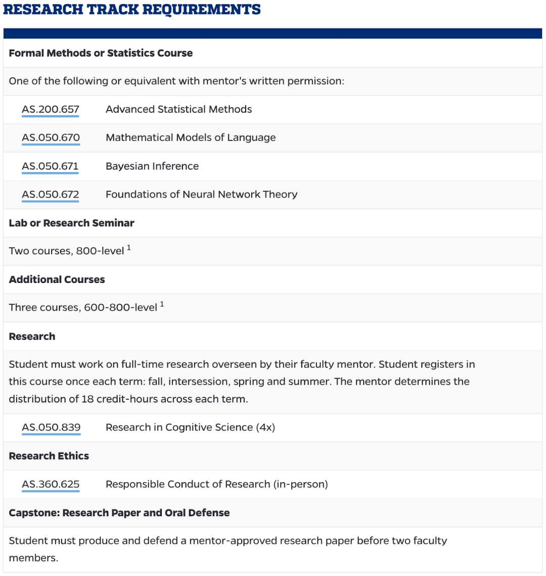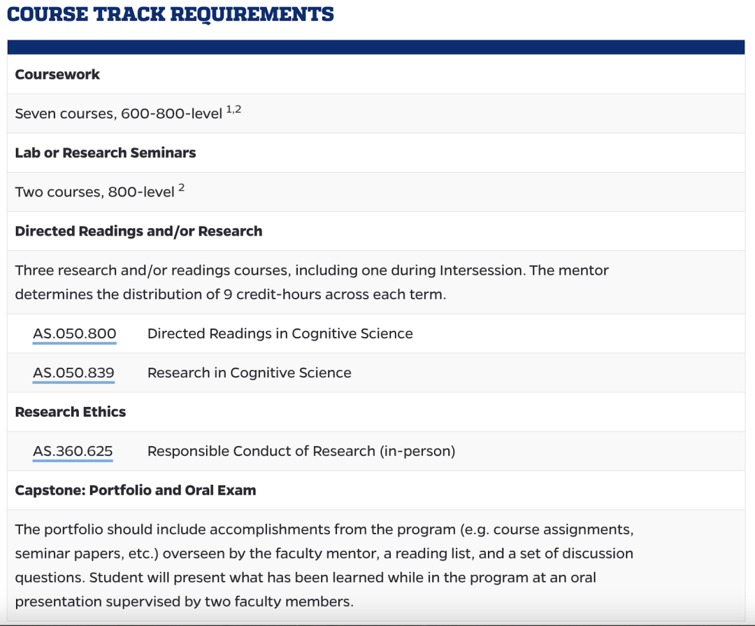 该项目的课程设置借鉴了其他几个院系提供的课程,要求学生们从多个不同的角度来研究大脑,也反映了认知科学的跨学科性质。 选择 课程方向(course track) 的同学需要完成以下要求:
