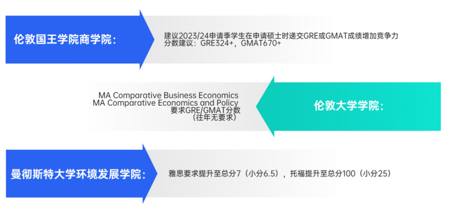 部分英国学校因为审理量过大,开始在语言要求上做文章,例如提高雅思/托福分数,增加 GMAT/GRE 要求。