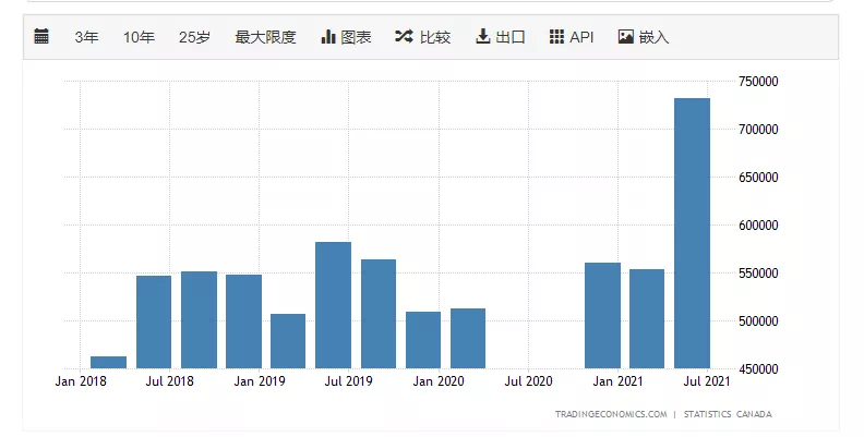 看看这数据统计,前几年都保持在50万左右,但2021年7月暴涨,直接多了20万!随着疫情的好转,加拿大政府急切需要振兴经济,对人才的需求也是日渐增长。