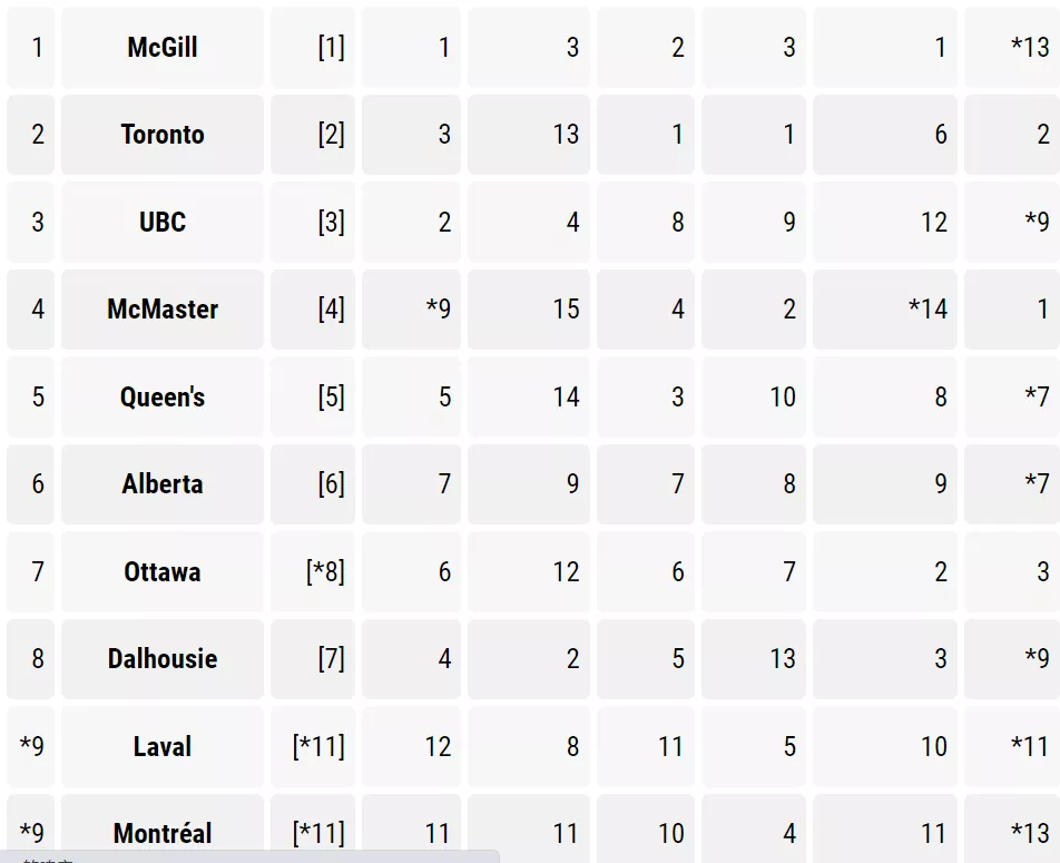 根据加拿大权威排名麦考林的排名,15个最优秀的医学博士类大学如下: