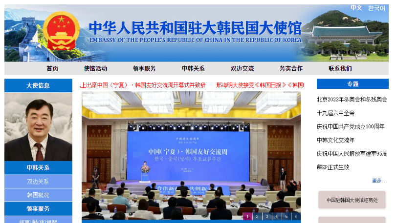 - 中国驻各国的大使馆官网:(以韩国为例)