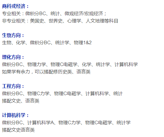 微积分AB/BC、物理C力学、物理C电磁学、微观经济、宏观经济、统计、化学、物理1、物理2、美国史、心理学、计算机科学。