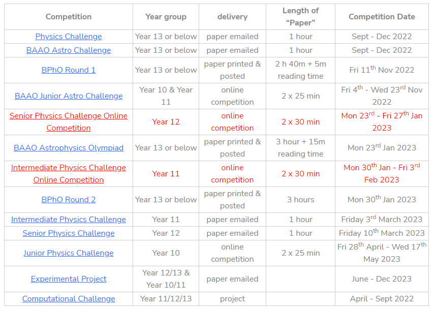 BPhO AS Challenge目前有1月和3月的两个考试时间。A2 challenge 10月 左右,Round 1考试一般在11月左右,Round 2在1月末2月初左右。2022年的Junior Physics Challenge(year 10),Intermediate Physics Challenge (year 11),Senior Physics Challenge (Year 12)都已经结束,2022年和2023年BPhO都提供了相应阶段的online竞赛。