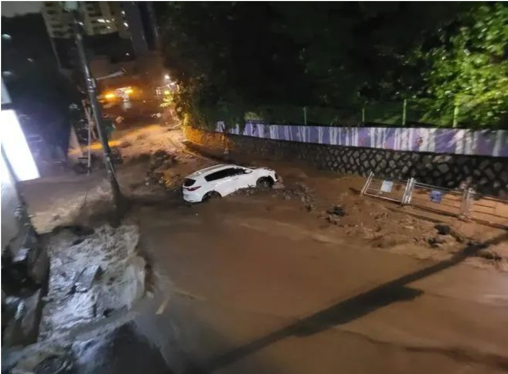 8日晚,韩国首尔部分地区遭遇极端强降水,降雨量达到了每小时100毫米以上,其中首尔铜雀区每小时降雨量超过了141.5毫米,累计降雨量达到了433毫米,创下1942年以来最大降水量。