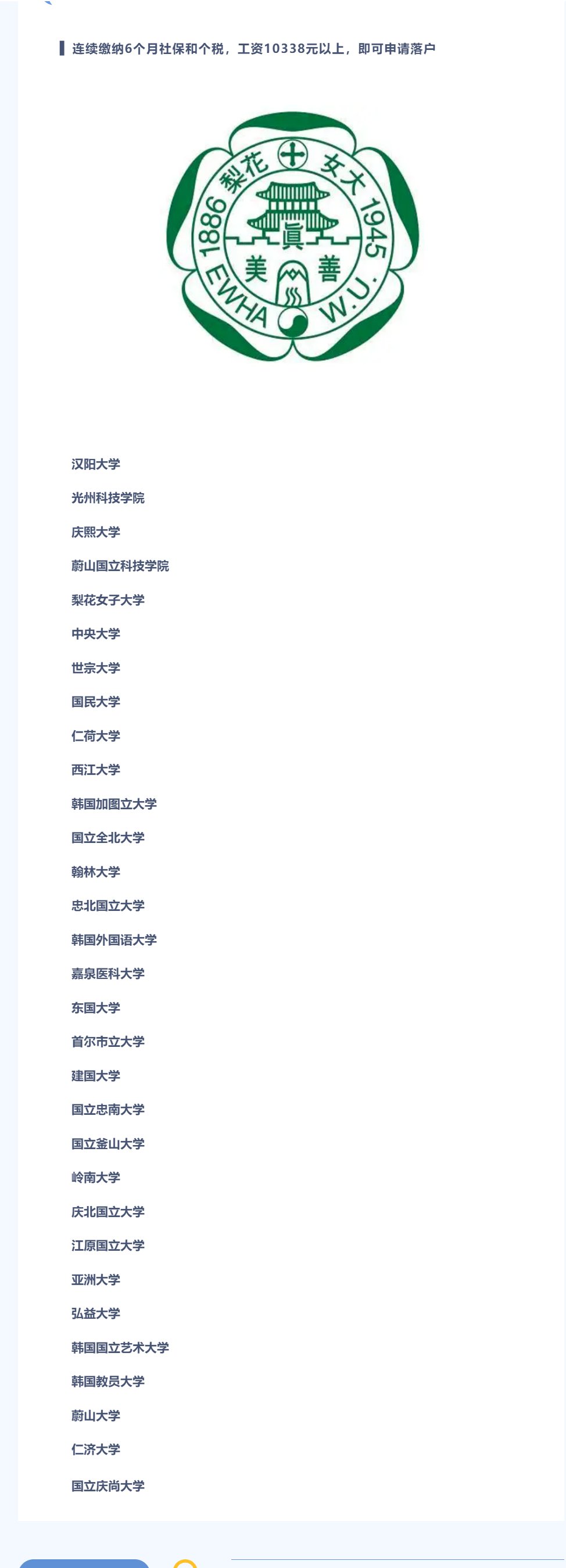 据上海最新公布的留学生落户政策,名单上的韩国大学留学生中,本科、硕士在上海工作半年后可申请落户,工资要求10338元以上,大大节约了留学生落户上海的周期和成本。