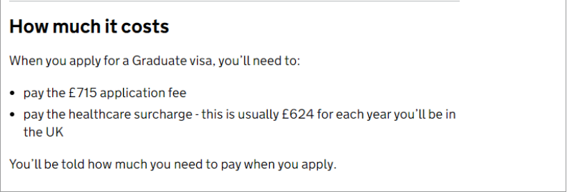 其次, PSW签证的申请费用并不低 。以研究生为例,2年的psw签证费用为:715英镑的签证费+每年624英镑的医疗附加费,总计为1963英镑。除此之外,在英国停留这两年产生的生活各项费用也是一笔不小的开销。