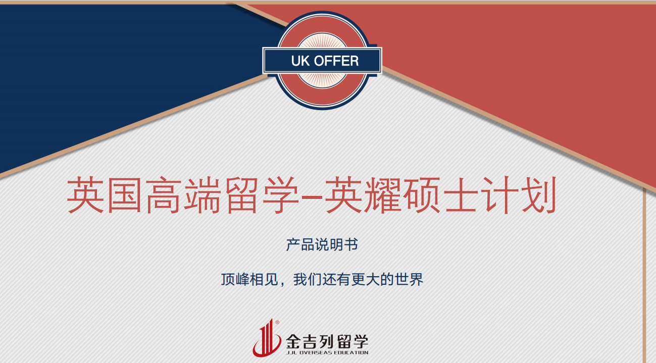 英国高端留学产品·英耀硕士计划-是金吉列留学英国条线推出的全新留学产品,旨在通过为学生规划赋能,匹配全资深文案和留学咨询师团队,海外名校导师助阵加持,利用五维立体模型的科学分析方法,真正的助力留学申请,实现名校梦!