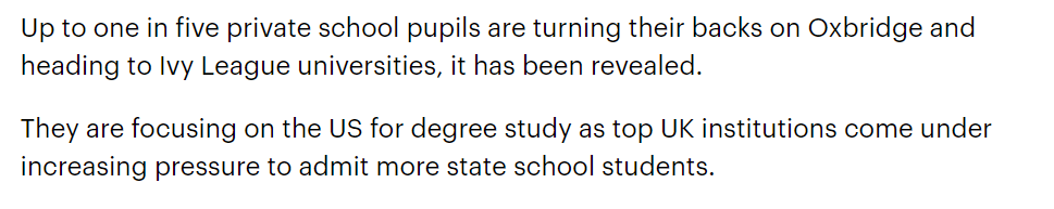 伦敦西北部独立弗朗西斯荷兰学校的校长 Lucy Elphinstone 强调了在牛津剑桥获得名额的“越来越困难”,尤其是从私立学校获得名额。 实际上,这样残酷的局面,早也在我们前两天的推文内容中得到了印证—— 英国最新消息曝出: 今年约有2.8万名A-level学生还没有收到任何大学录取通知书,面临无大学可上的窘境 。