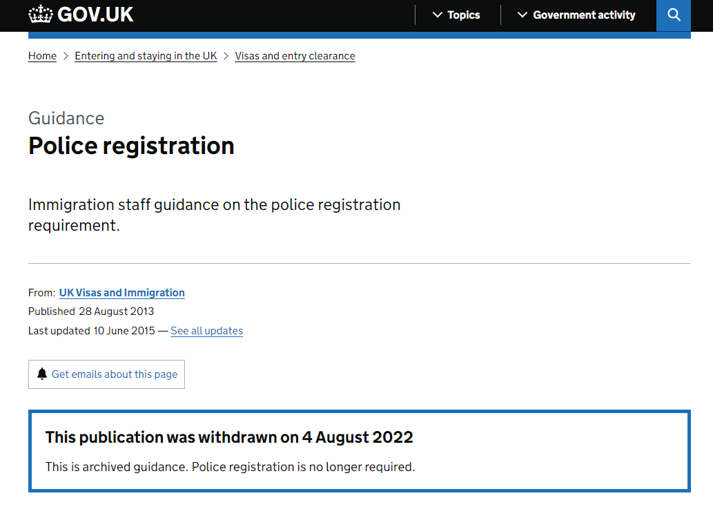 根据英国政府最新规定,2022年8月4日起不再需要警局注册。